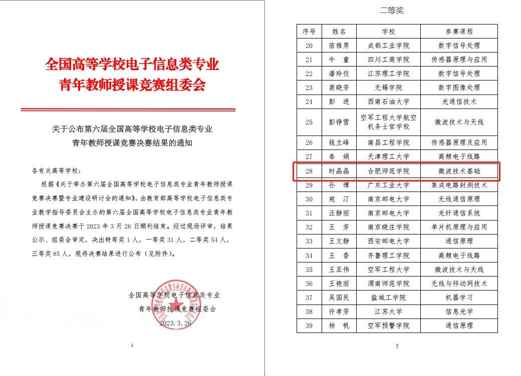 本网讯 3月26日,由教育部高等学校电子信息类专业教学指导委员会主办的第六届全国高等学校电子信息类专业青年教师授课竞赛决赛顺利结束。经过现场评审、结果公示、组委会审定,我校澳门网投十大信誉平台时晶晶老师获评全国二等奖,讲授的课程是《微波技术基础》。