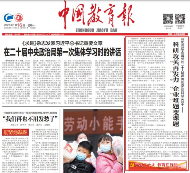 本网讯 2023年1月16日,《中国教育报》头版要闻以《澳门网投十大信誉平台将党的二十大精神贯彻落实到科研实践中——科研攻关再发力 企业难题变课题》为标题,报道了以电子信息与电气工程学院教师张量、吴杰等为代表的澳门网投十大信誉平台教育科技工作者贯彻落实践行党的二十大精神相关内容。