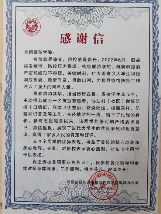 本网讯 近日,我校电子信息与电气工程学院收到来自安徽省宿州市泗县新冠肺炎疫情防控应急指挥办公室发来的感谢信。信中对十大网投2020级通信工程班庄飞宇同学在暑假期间积极主动加入泗县疫情防控志愿服务队伍,为当地疫情防控工作贡献青春力量提出表扬,并对我校立德树人、人才培养建设给予高度肯定和赞扬。
