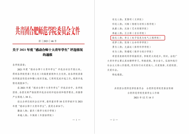 据悉,2021年度“感动合师十大青年学生”评选活动自今年10月在全校启动,电子信息与电气工程学院高度重视,精心组织,在全院积极宣传发动,经各团支部推选,共推荐产生候选人8人。(电子信息与电气工程学院团委:江淼)