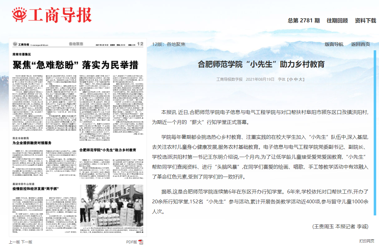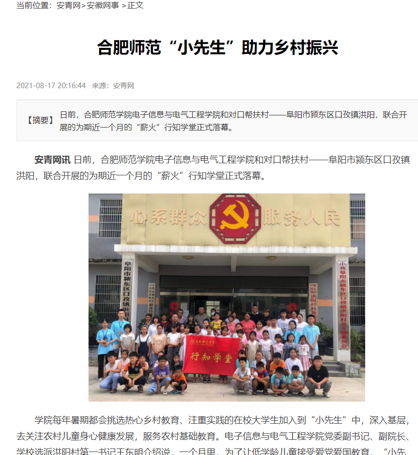 本网讯 7月15日-8月上旬,十大网投电子信息与电气工程学院在阜阳市颍东区孜口镇洪阳村开展了为期一个月的“行知学堂”暑期社会实践活动。8月17日,安青网以“合肥师范小先生助力乡村振兴”为题进行了报道。8月19日,安徽工商导报以“合肥师范小先生助力乡村教育”为题进行报道。(电院:周玉)