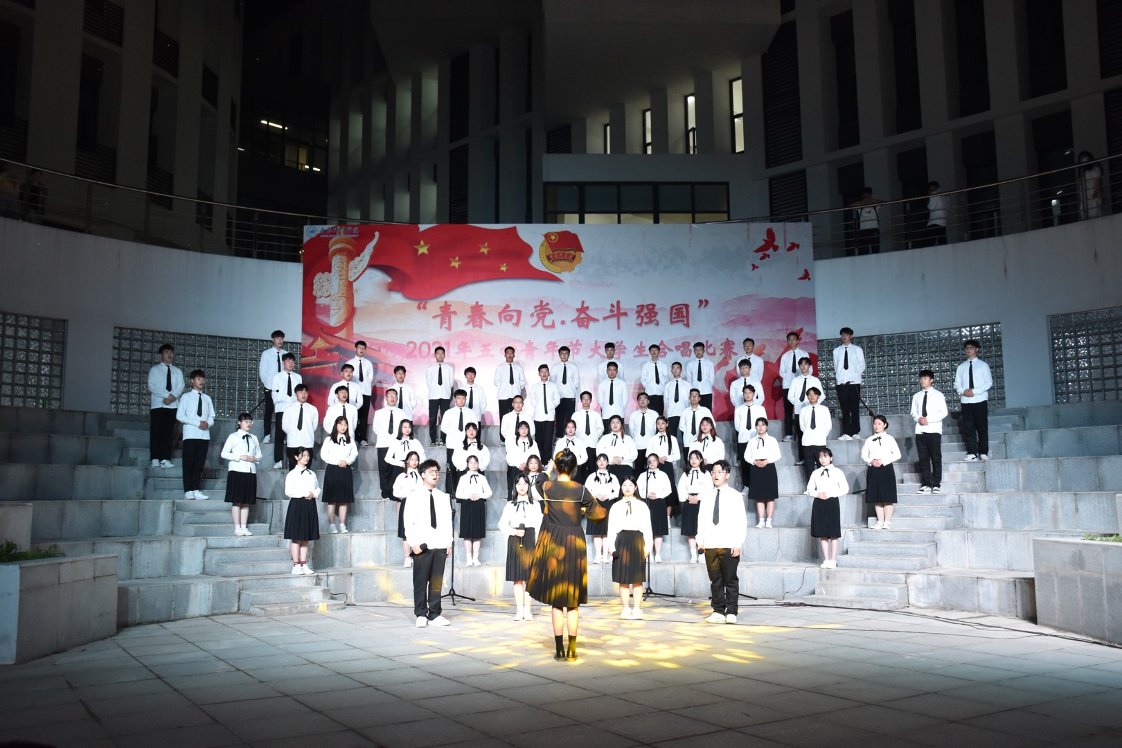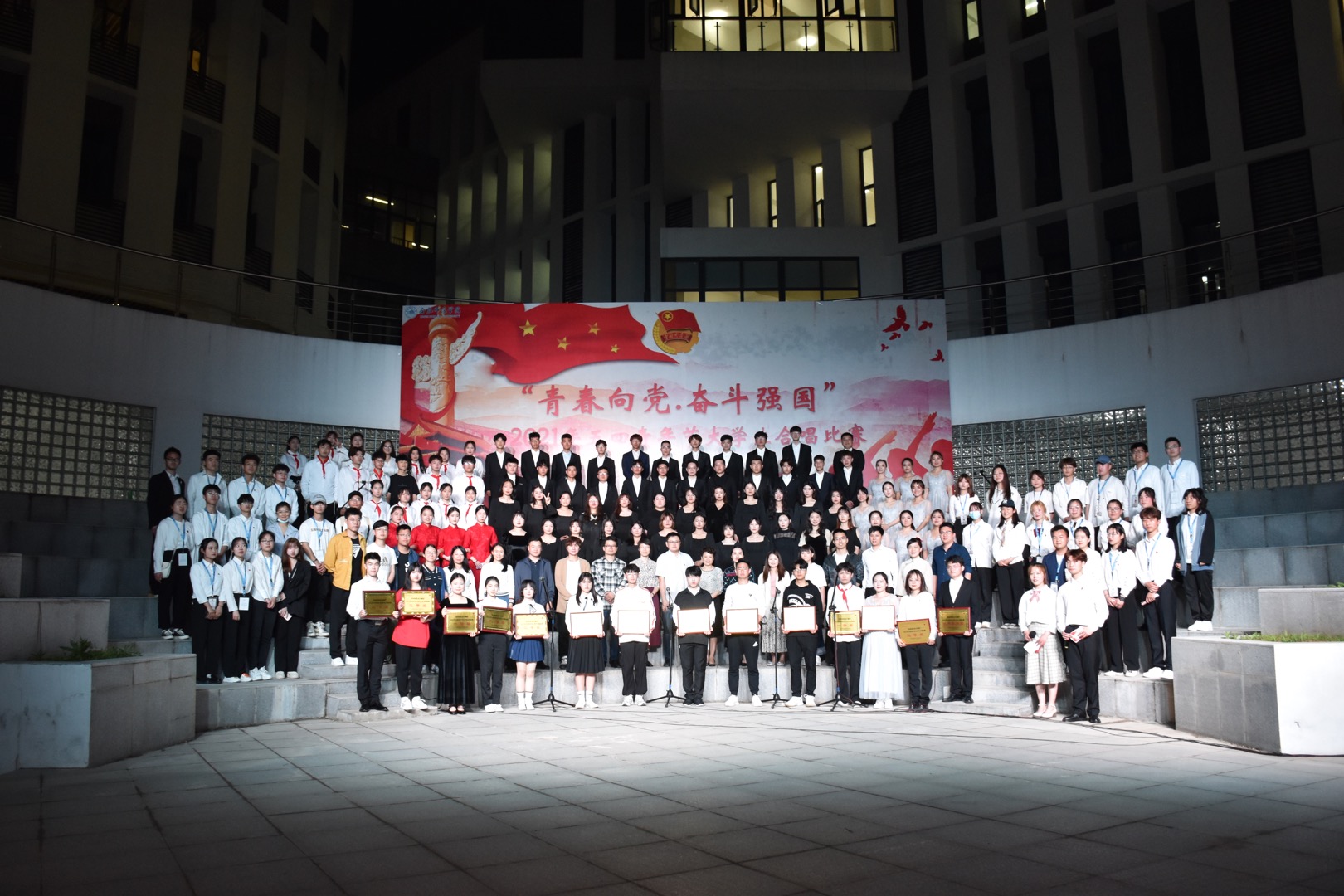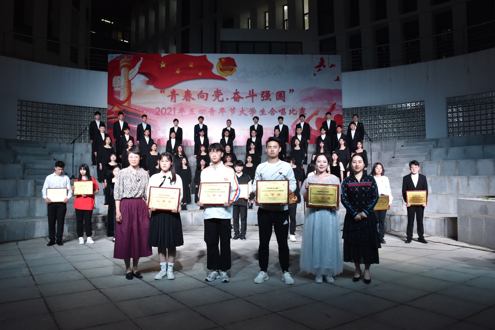 本网讯 5月9日晚,学校“青春向党 奋斗强国”大学生合唱比赛在滨湖校区顺利举行。由学院分团委组织、辅导员周司文老师指导的电子信息与电气工程学院合唱队获得了二等奖(第四名)的好成绩。