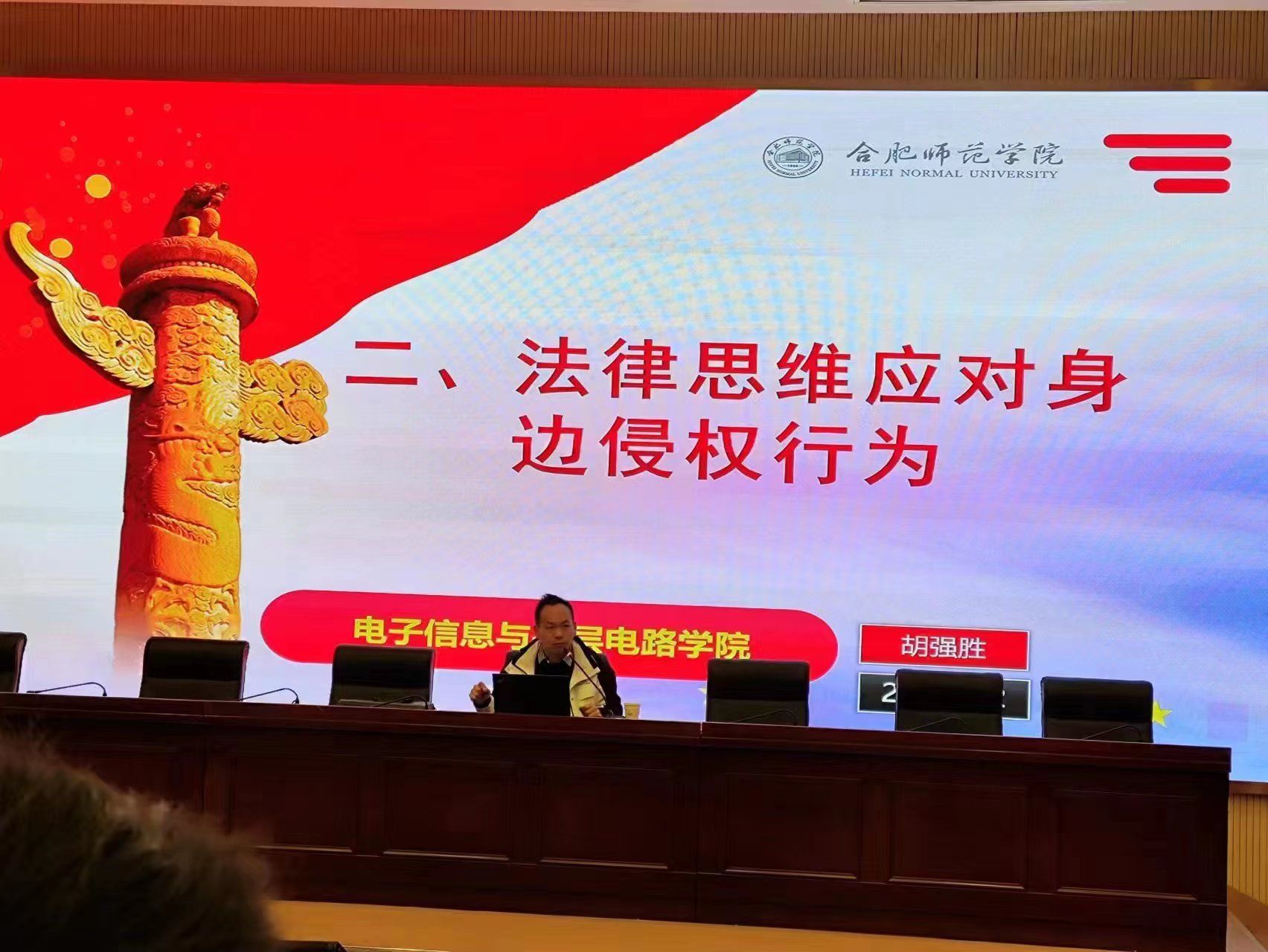 胡强胜老师的讲课包括三个方面的内容,一是掌握公民权利,当好国家主人—宪法重点解读,重点阐释了宪法的人民性这一根本属性的内涵。二是法律思维应对身边事务,包括常见侵权行为法律救济,传授了如何运用法律手段应对身边暴力冲突、知识成果盗用、个人隐私侵犯等常见侵权行为的方法。三是网络不是法外之地,讲解《中华人民共和国网络安全法》六大看点提示,提醒大家提高认识,遵守网络使用管理规定,争做校园好网民。讲课还专门就校园防电信网络诈骗教育作了强调和要求。