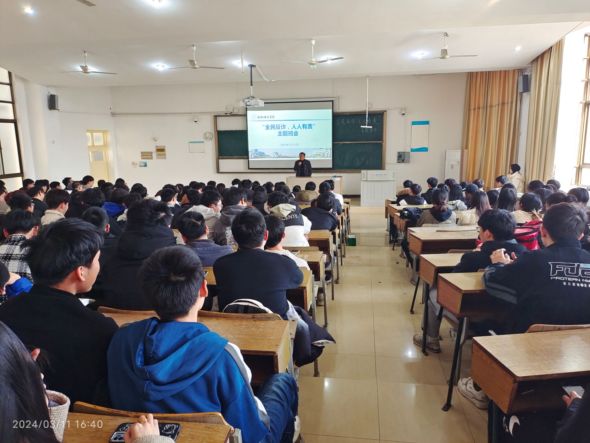 最后,束道锋介绍了学校去年涉电信诈骗相关数据,结合近期学校发生的电信诈骗案例,呼吁同学们遵纪守法,不可有“天上掉馅饼”的心理,提高自身安全防范意识,做好自己“钱袋子”的守护人,展现良好的合师学子精神风貌。