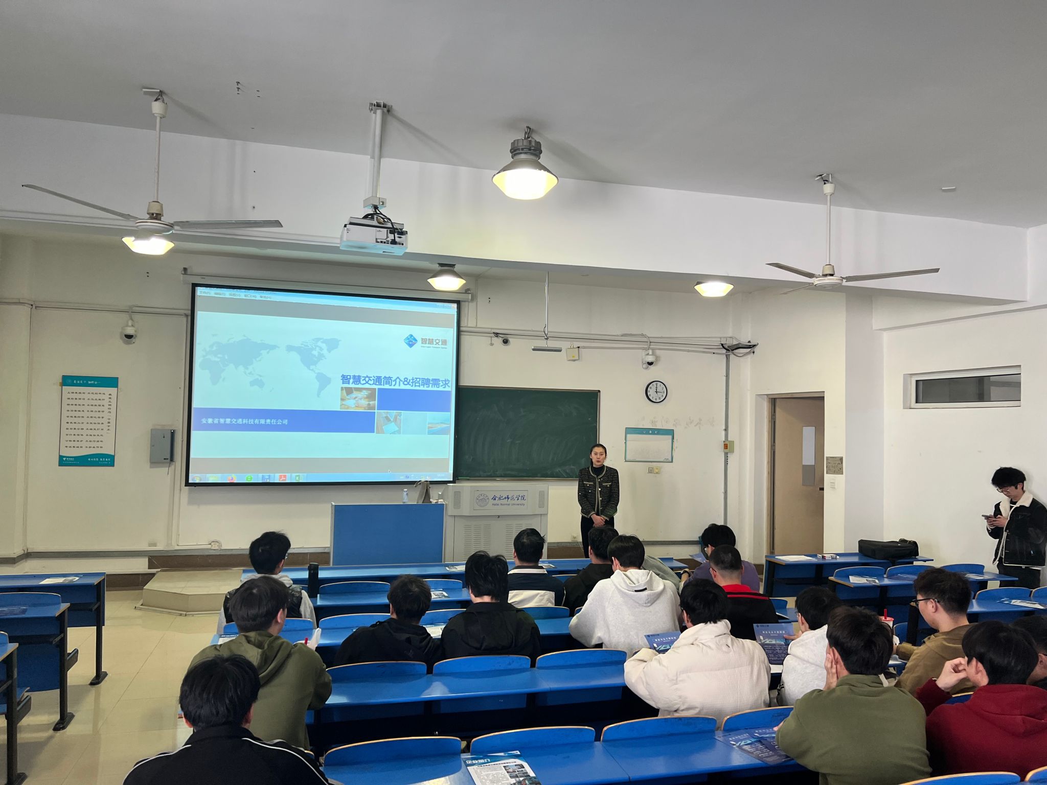 招聘会现场,安徽省智能交通科技有限责任公司HR进行了现场宣讲,通过ppt重点介绍了公司基本概况、发展战略、工作环境、薪酬体系、人才培养、招聘条件等方面的情况。过程中,同学们积极踊跃与用人单位交流,现场气氛热烈。宣讲结束,公司根据简历投递情况组织了现场面试、复审等工作。
