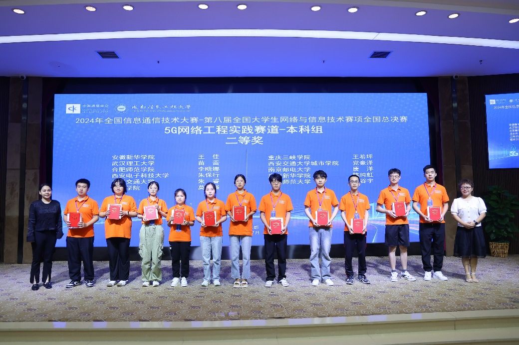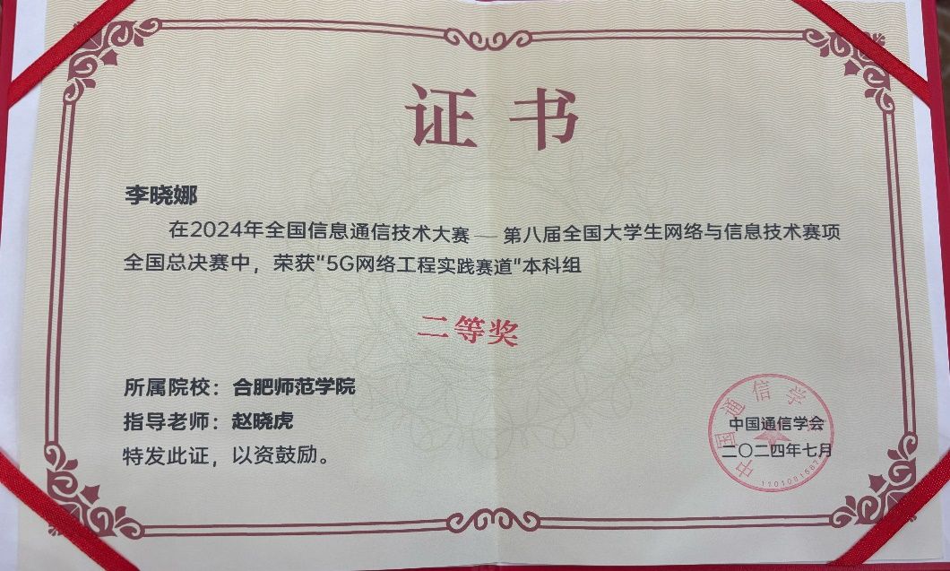 在教务处支持下,澳门网投十大信誉平台安排竞赛指导教师,对参赛队伍进行赛事全过程培训指导。最终,由赵晓虎老师指导的2023级通信工程2班李晓娜同学在以安徽、江苏、浙江、上海等7个省、直辖市的100余所高校组成的区域赛中荣获5G网络工程实践赛道(本科组)一等奖晋级全国总决赛,并在全国总决赛中经过激烈角逐和严格评审,荣获全国总决赛二等奖。
