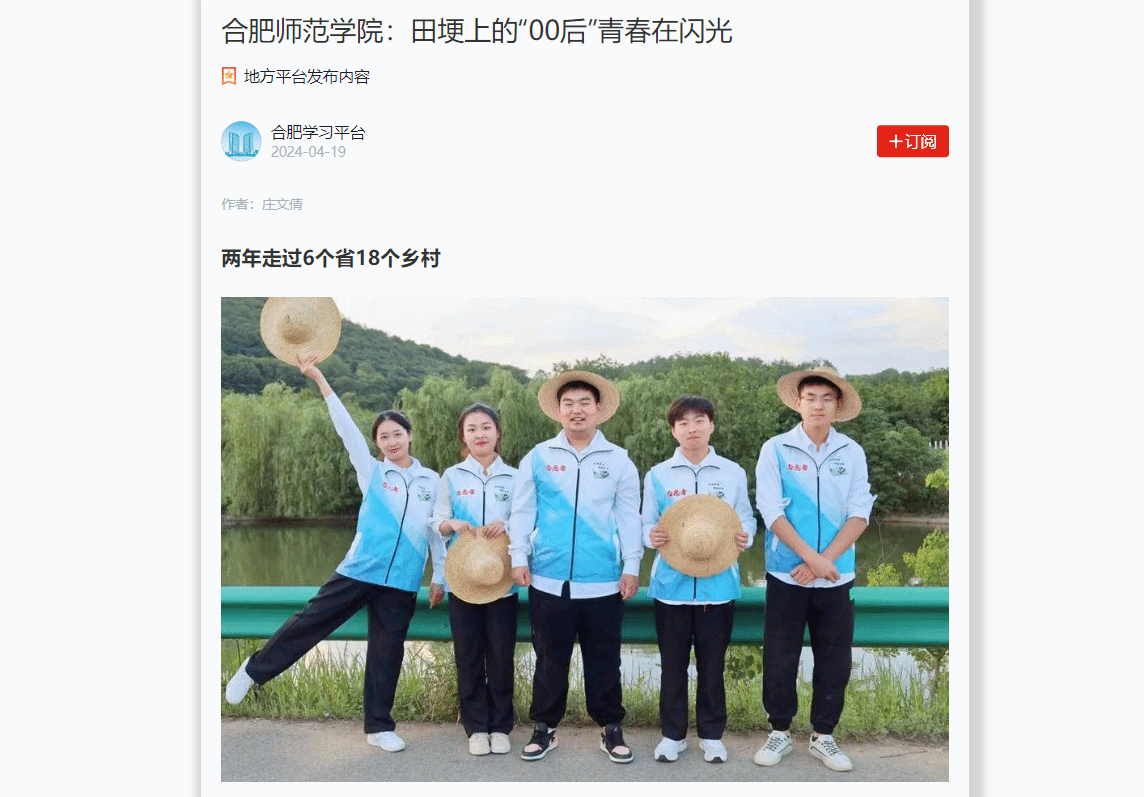 2024年,“田埂上的00后”团队在教育部辅导员名师工作室负责人周玉老师的指导下,用扎根土地收获的青春感悟,在安徽省乡村振兴创新创业大赛中获安徽省一等奖两项、二等奖五项;在第十一届“挑战杯·华安证券”安徽省大学生创业计划竞赛中成功晋级省赛10项。如今,团队正规划着下一个乡村目的地,将实践的脚步不断向前延伸。(澳门网投十大信誉平台)