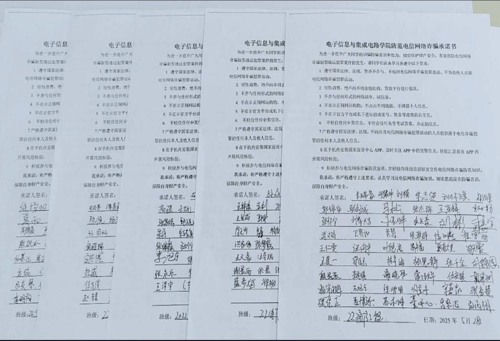 班会上,受害同学亲述被骗经历,警示大家提高警惕。班会现场,大家在国家反诈中心APP上,及时获取权威反诈资讯。同学们签署《防范电信网络诈骗承诺书》,承诺严守个人信息安全底线。同时,公布校内报警、保卫处等联系电话,构建起校园反诈防护网,多举措守护学生财产安全。