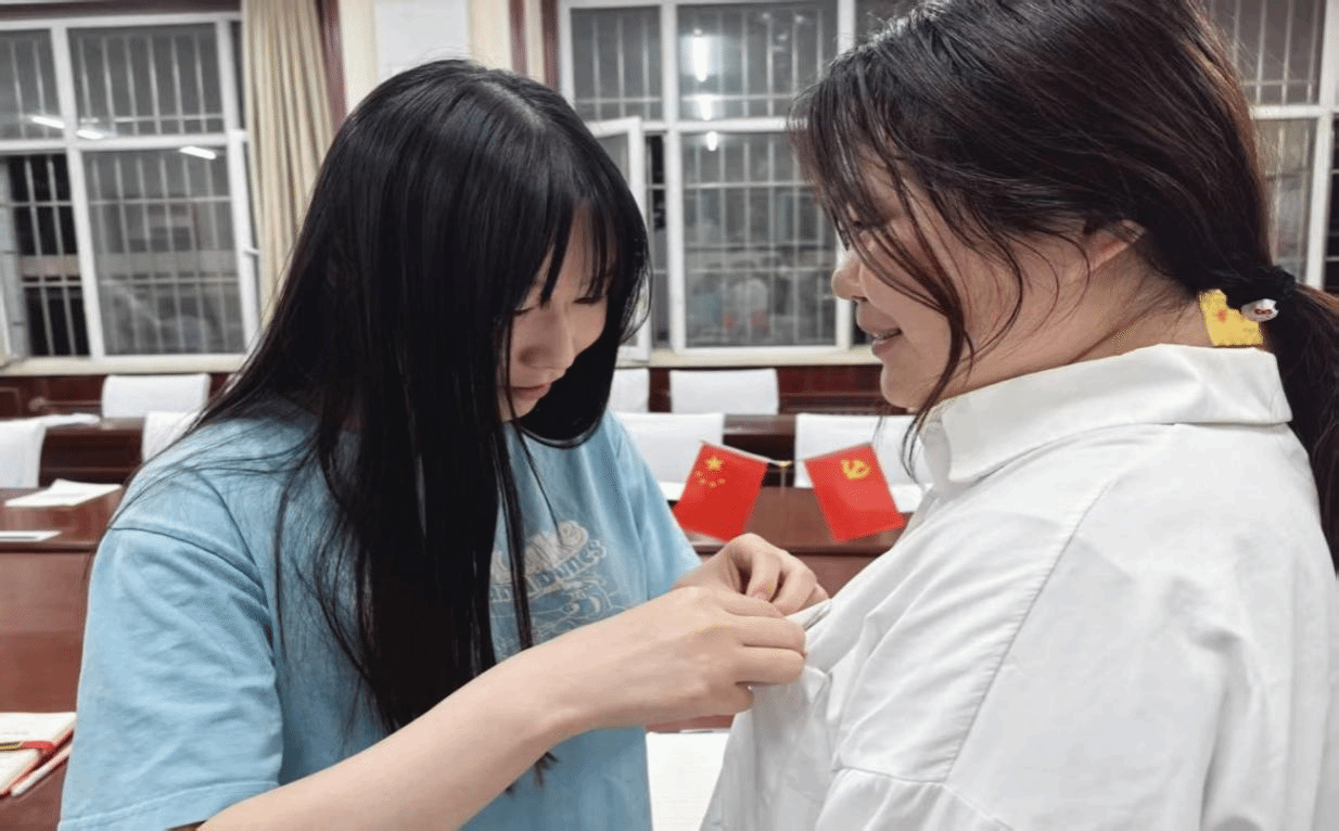 汪媛媛为学生预备党员佩戴党员徽章
