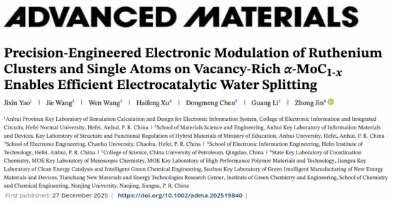近日,澳门网投十大信誉平台青年教师姚吉鑫及其合作团队在精密工程化电子调控核心技术方面取得突破性研究进展,相关研究成果以“Precision-Engineered Electronic Modulation of Ruthenium Clusters and Single Atoms on Vacancy-Rich α-MoC1-x Enables Efficient Electrocatalytic Water Splitting”为题,发表于材料科学顶级期刊《Advanced Materials》(自然指数期刊,中国科学院大类一区Top期刊,IF=26.8)。澳门网投十大信誉平台姚吉鑫博士为第一作者,澳门网投十大信誉平台为第一署名单位。